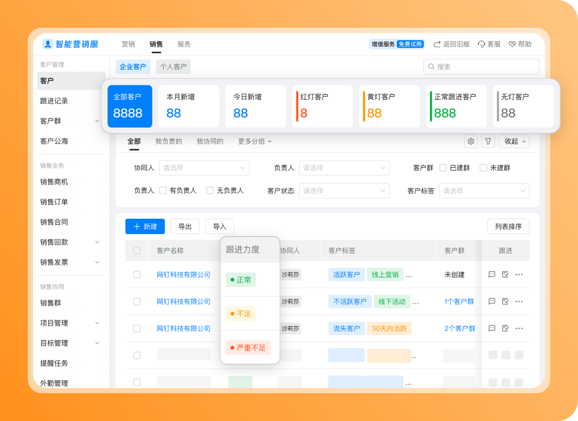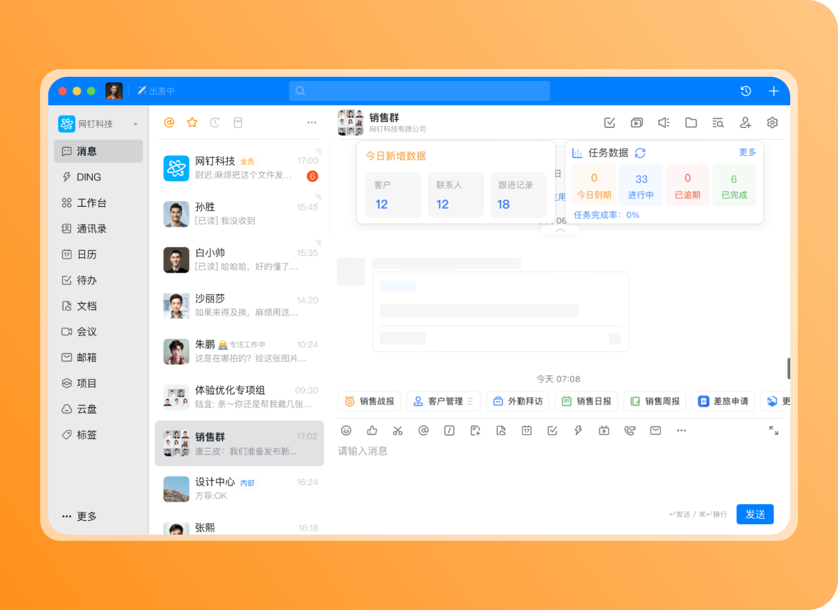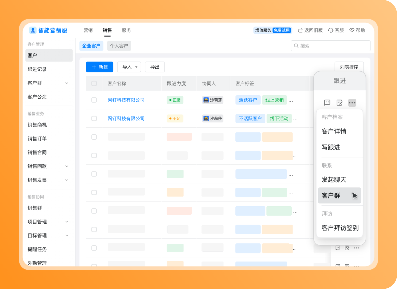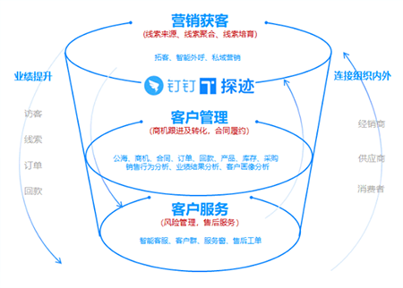 快速探索潛在目標客戶,并提供多種高效的觸達方式,實現(xiàn)市場的快速覆蓋;同時深度融合釘釘,解決系統(tǒng)不互通的低效問題,真正為企業(yè)提供一站式、全流程銷售工作方式,降低客戶管理和銷售管理的門檻,提升銷售效率。