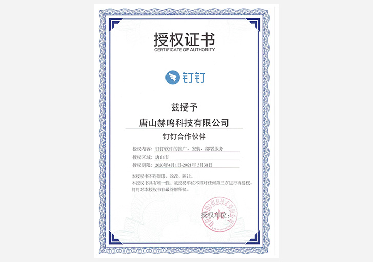2019年3月7日被阿里釘釘授權(quán)為唐山釘釘部署服務(wù)商,正式與阿里釘釘成為合作伙伴;