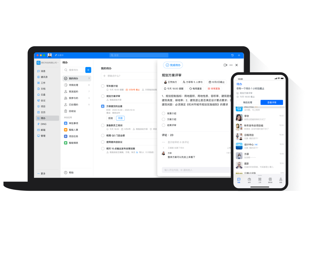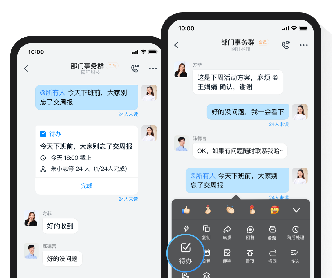 釘釘群直接創(chuàng)建待辦,指派到人,還可添加協(xié)作同事,一鍵催辦,確保事情件件落實(shí)。