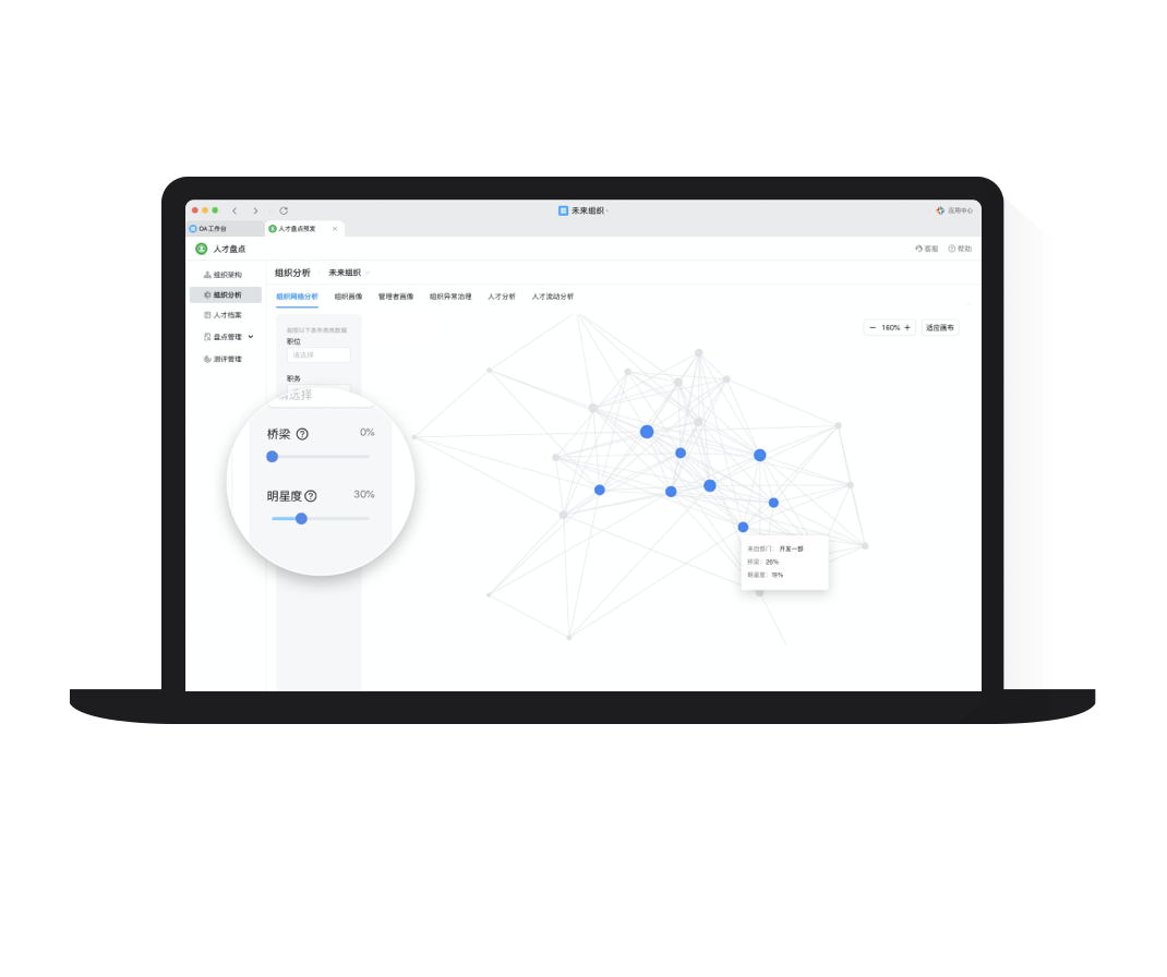 組織分析通過大數(shù)據(jù)智能分析,刻畫組織和人才畫像,描繪組織溝通網(wǎng)絡(luò)行為,幫助看清組織現(xiàn)狀,并跟蹤治理核心指標(biāo)。
